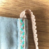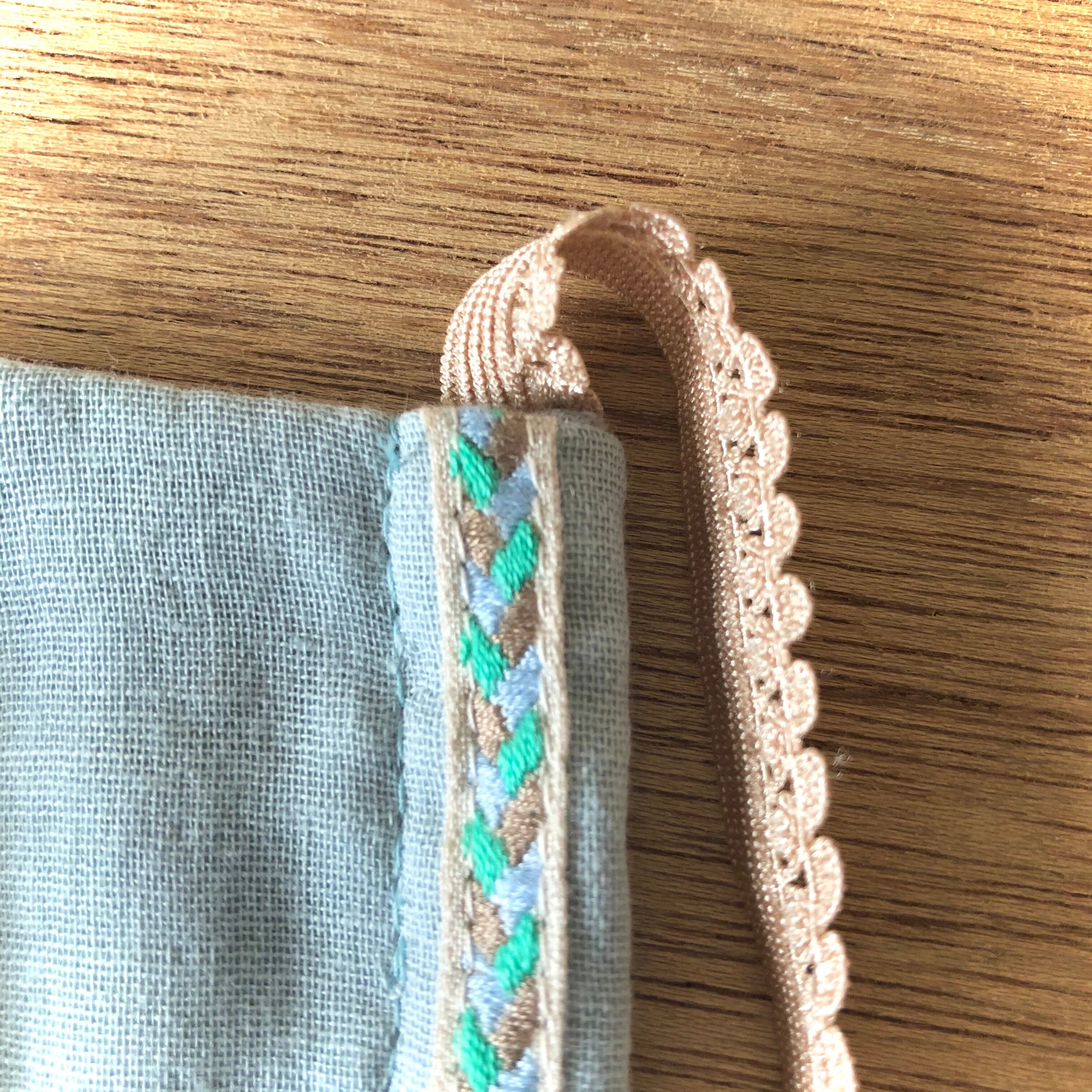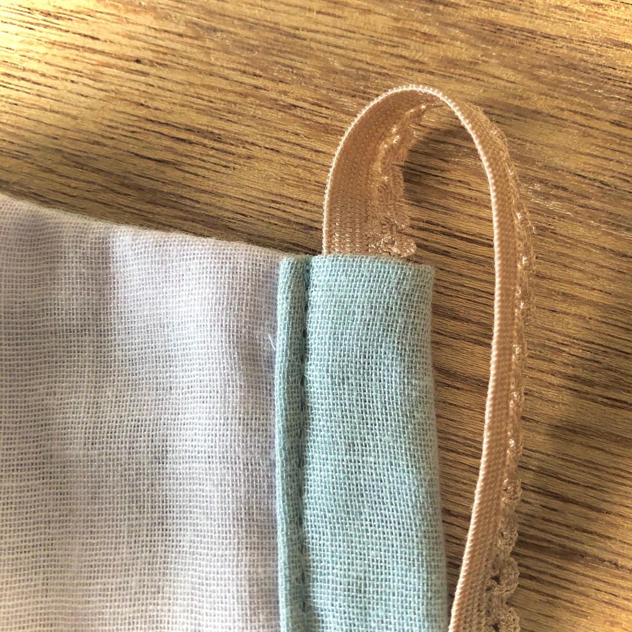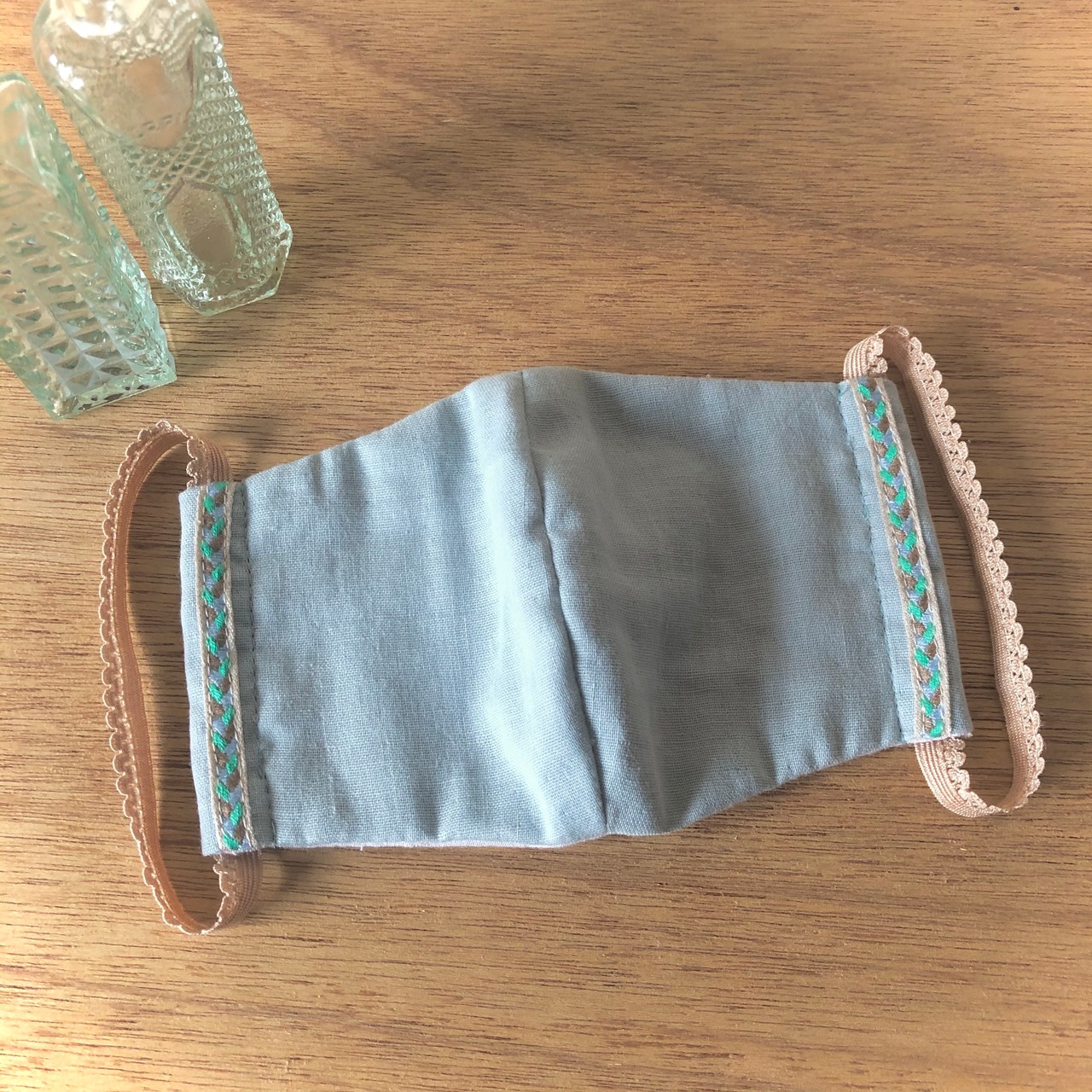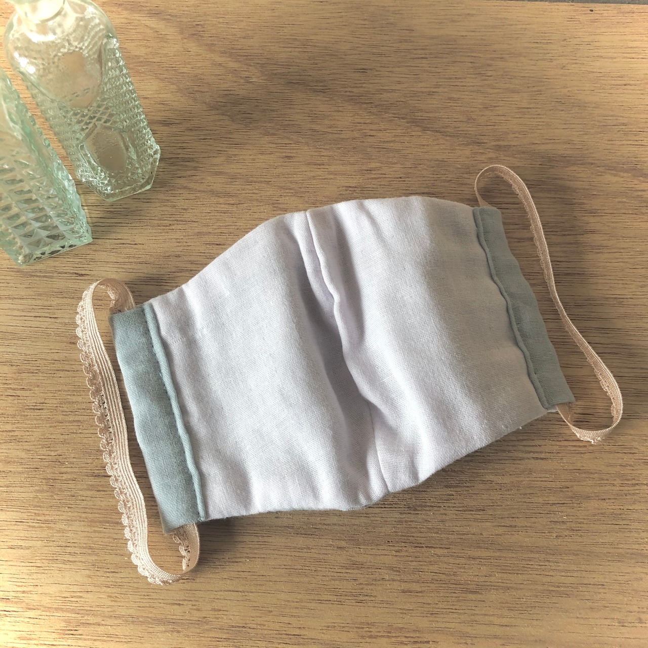 柔らかいパステルカラーとかわいい織のリボンをアクセントにしたデザインのマスクです。