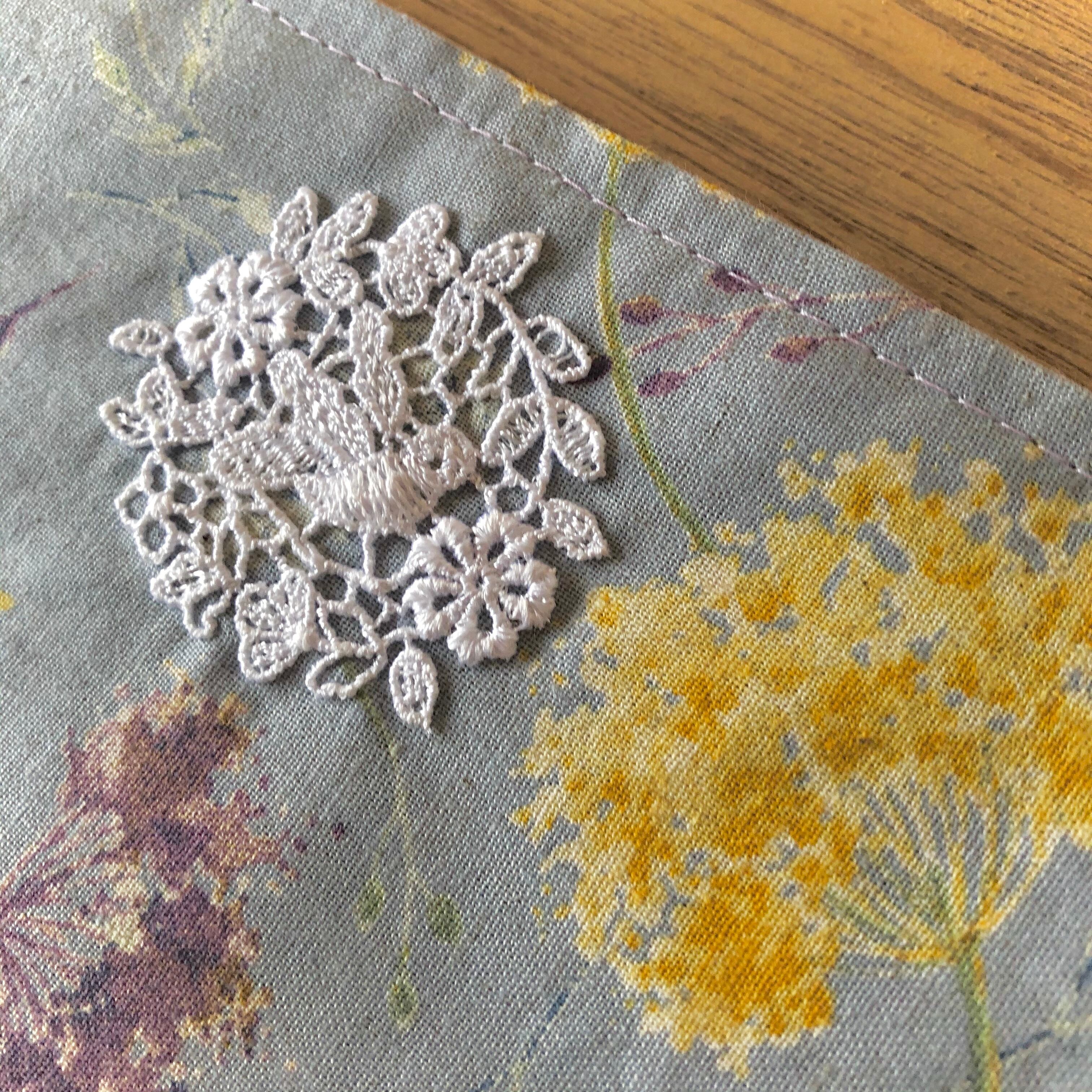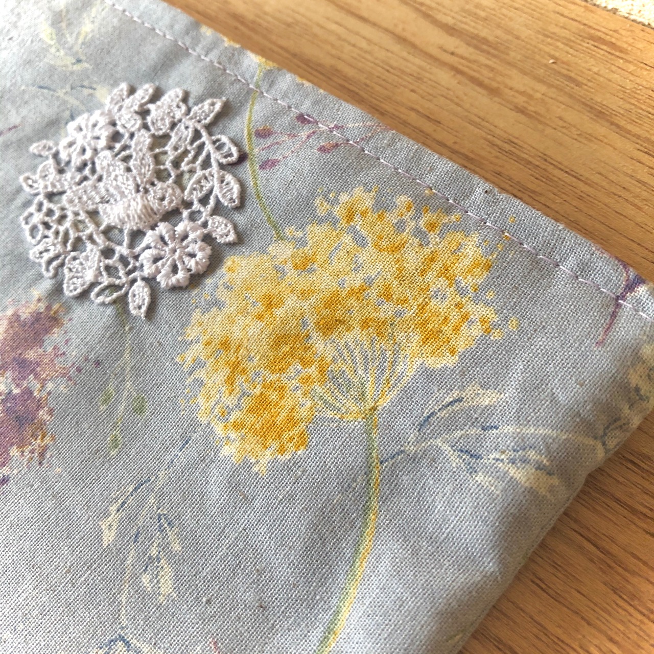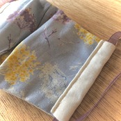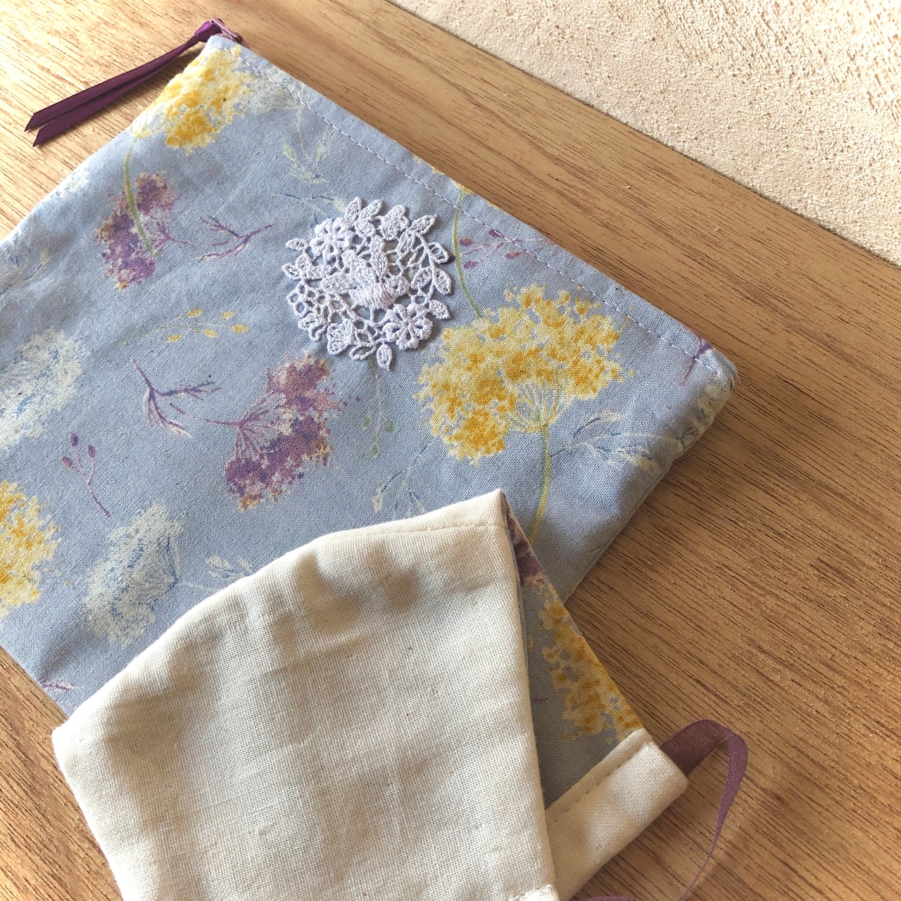 表面は柔らかいアイボリーのガーゼ生地、裏面はポーチと同柄の綿の生地を使用しています。