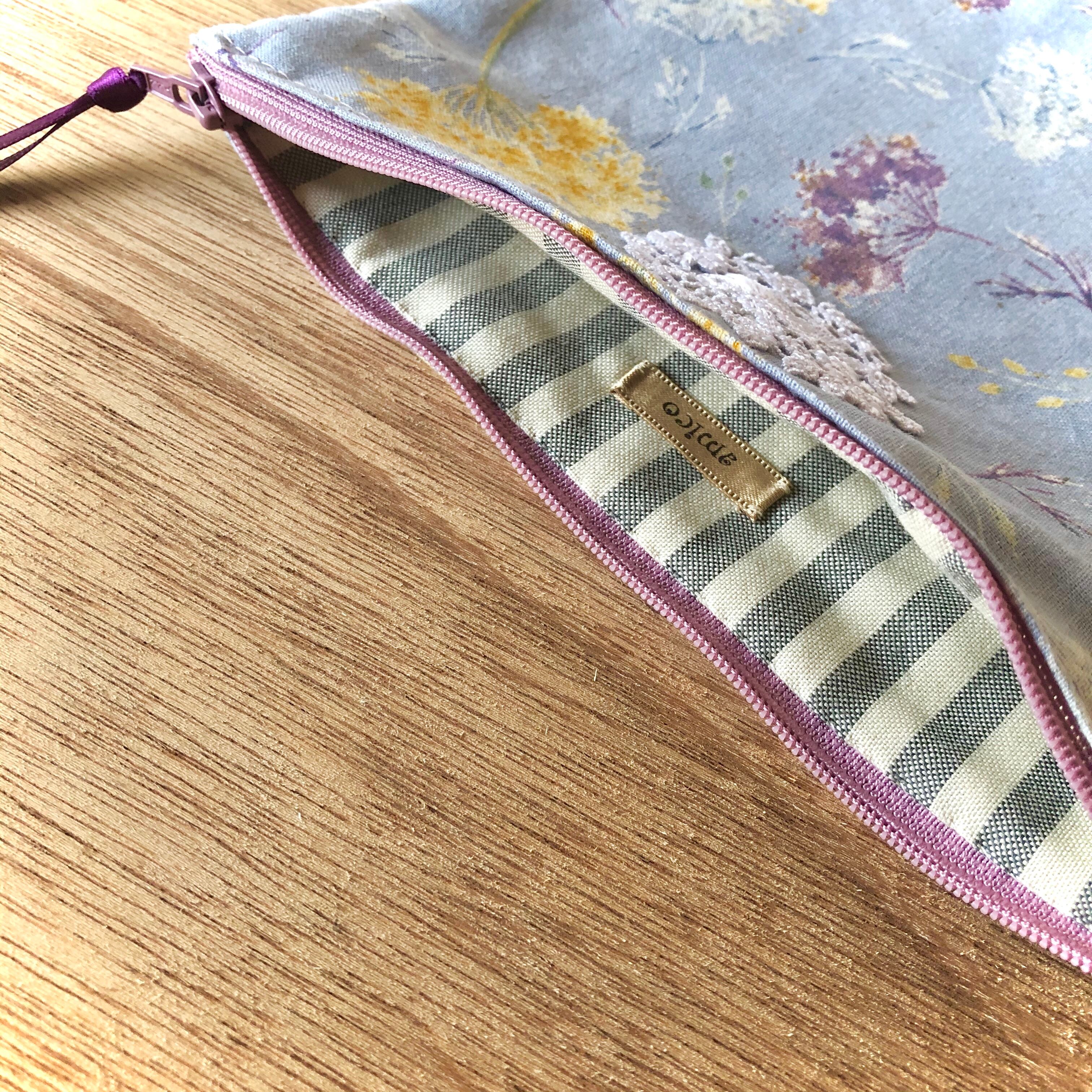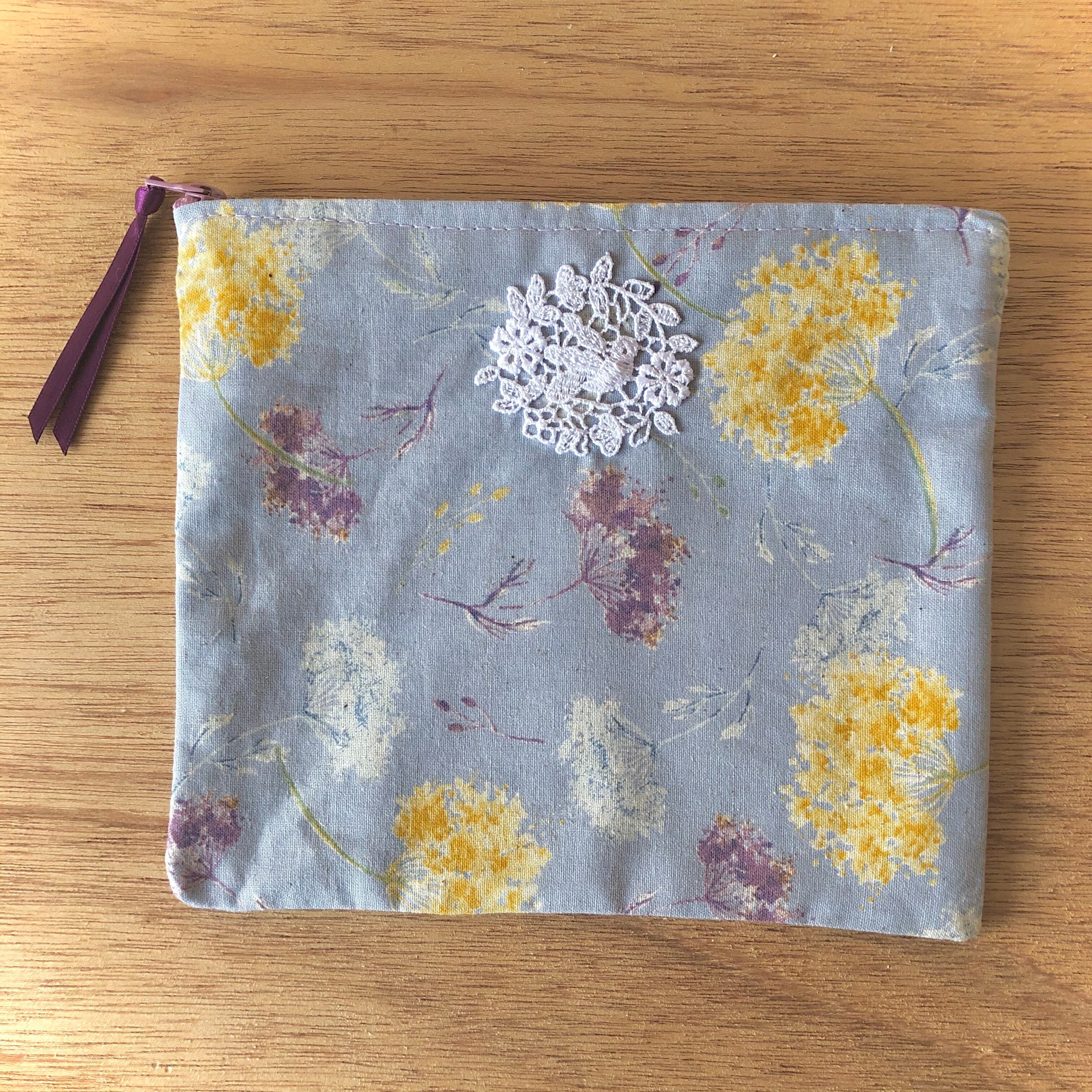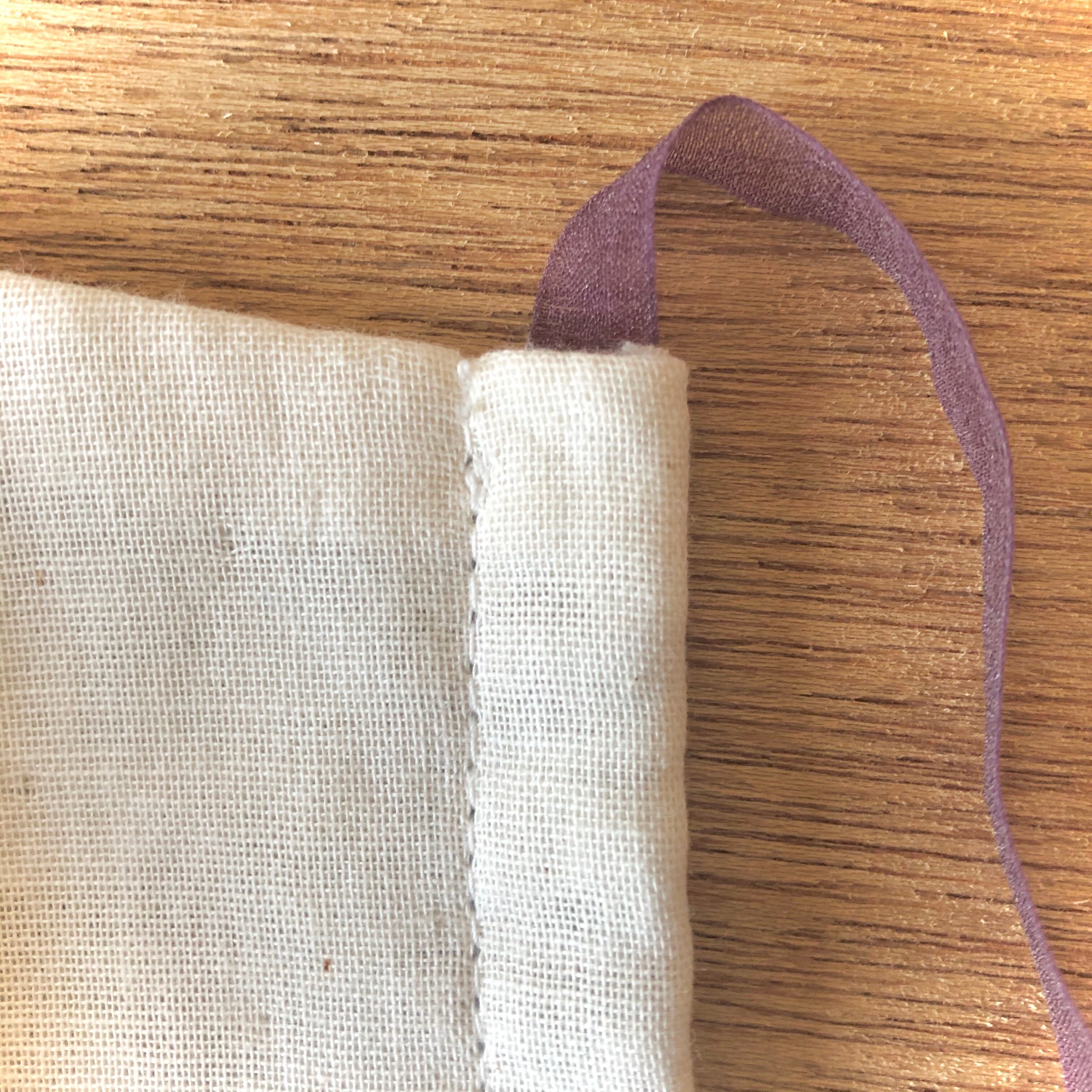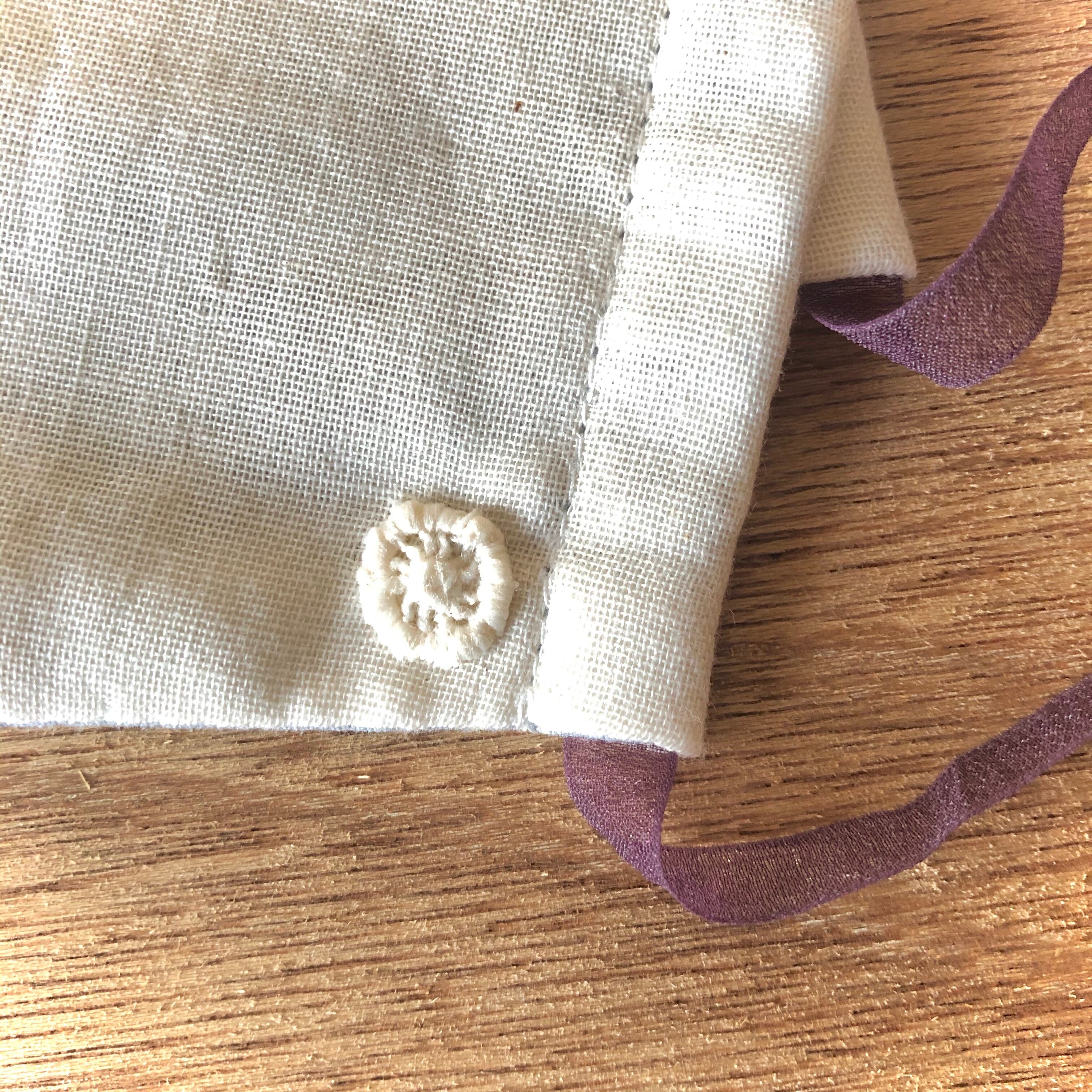 表面は柔らかいアイボリーのガーゼ生地、裏面はポーチと同柄の綿の生地を使用しています。